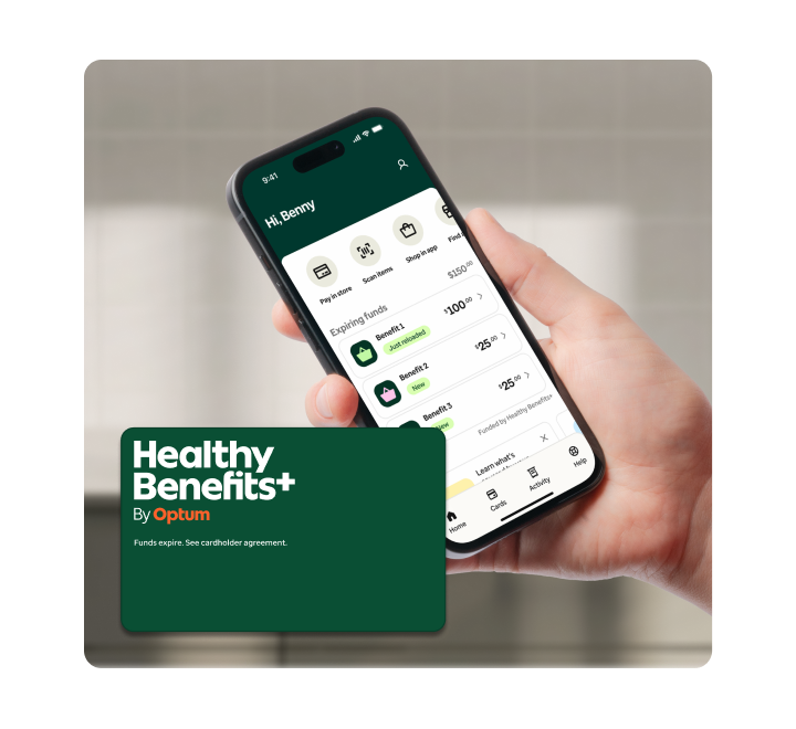 "Healthy Benefits+" refers to any benefit or reward program(s), and Healthy Benefits+ is offered by Optum Financial, Inc., on behalf of itself and its affiliates. Your participation in a Healthy Benefits+ program is voluntary and subject to eligibility rules and other restrictions included in the Healthy Benefits+ Cardholder Agreement. Funds made available for your use in the program(s) are subject to use restrictions, are not cash, and are not owned by you. You may only be eligible to participate in certain benefit programs as determined by your health plan or Optum Financial. All brands listed are trademarked by their respective manufacturers. Brands and item eligibility and/or availability are subject to change. Healthy Benefits+ benefits must be utilized at participating retailers and may only be used to purchase specific items in accordance with your benefit program. Other restrictions may apply.
